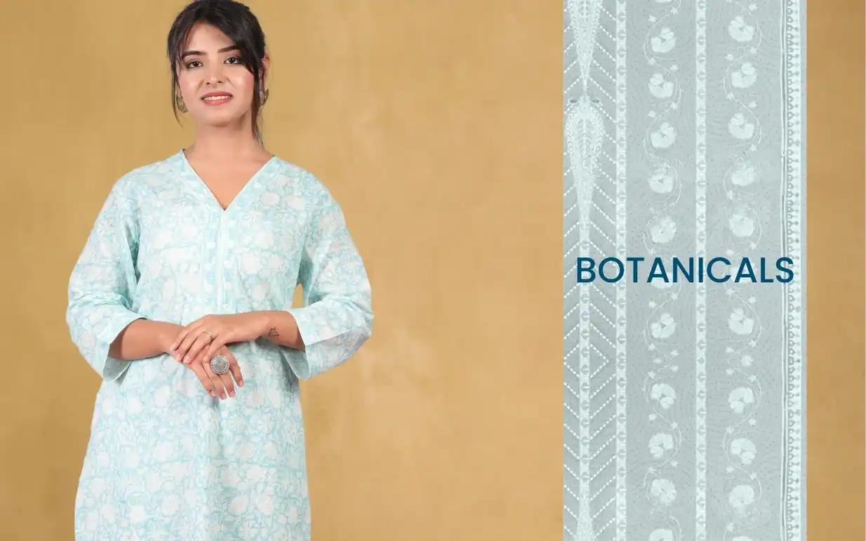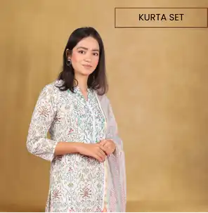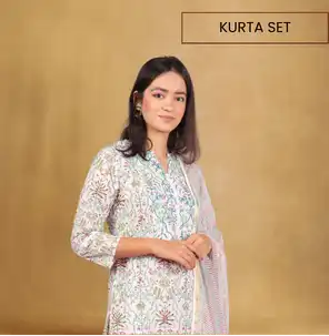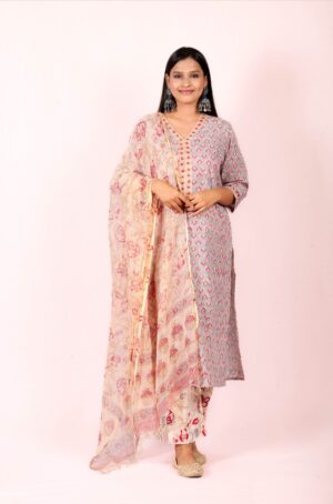 “Namika” Hand Block printed cotton Kurta Set with Kota Doriya Dupatta (3pc):